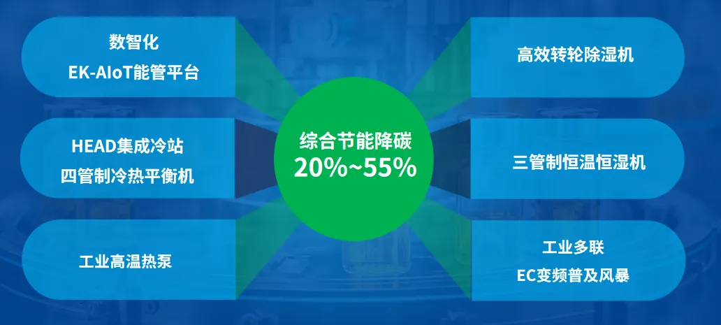 作为制药行业的空气处理专家,EK工业空调始终聚焦行业实际需求,打造覆盖工业冷热源、工业高温热泵、工业环境控制及工业氟系统等多领域的节能产品矩阵,包括HEAD高效集成冷站、四管制冷热平衡机、60~80℃中温热泵机组、80~120℃高温热泵机组、三管制恒温恒湿机、一体化高效转轮除湿机、EC风机墙、工业多联系列等绿色产品与系统方案。同时,依托EK工业空调自主研发的EK-AIoT工业物联网能源优化平台,实现对设备状态的智能监控与云端运维,为制药企业提供高效、低碳、可靠的温环境系统解决方案,切实帮助药企实现节能降耗与绿色运营。