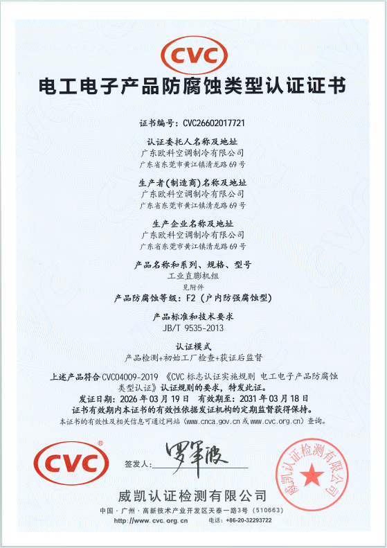 本次认证的防腐型外机涵盖热泵机组、单冷机组、氟泵机组及单元式机组,机组运行工况范围宽广,可实现低温制热、高温制冷、常规低温制冷及超低温制冷等多种应用,能够满足各类工业场景下的空调使用需求。